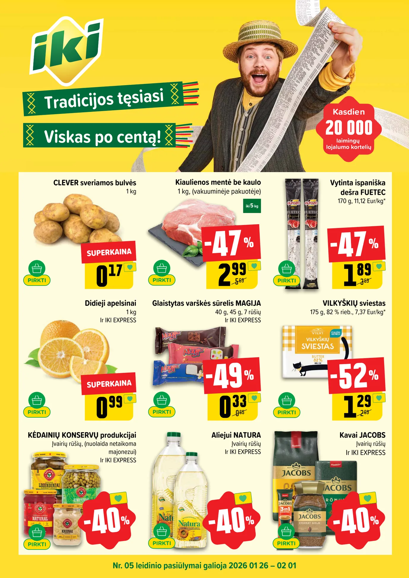 IKI akcijų leidinys Nr. 5 nuo sausio 26 d. IKI akcijos: Clever bulvės už 0.17€, kiaulienos mentė -47%, Fuetec dešra -47%, Magija sūrelis -49%, Jacobs kavai -40% ir daugiau!