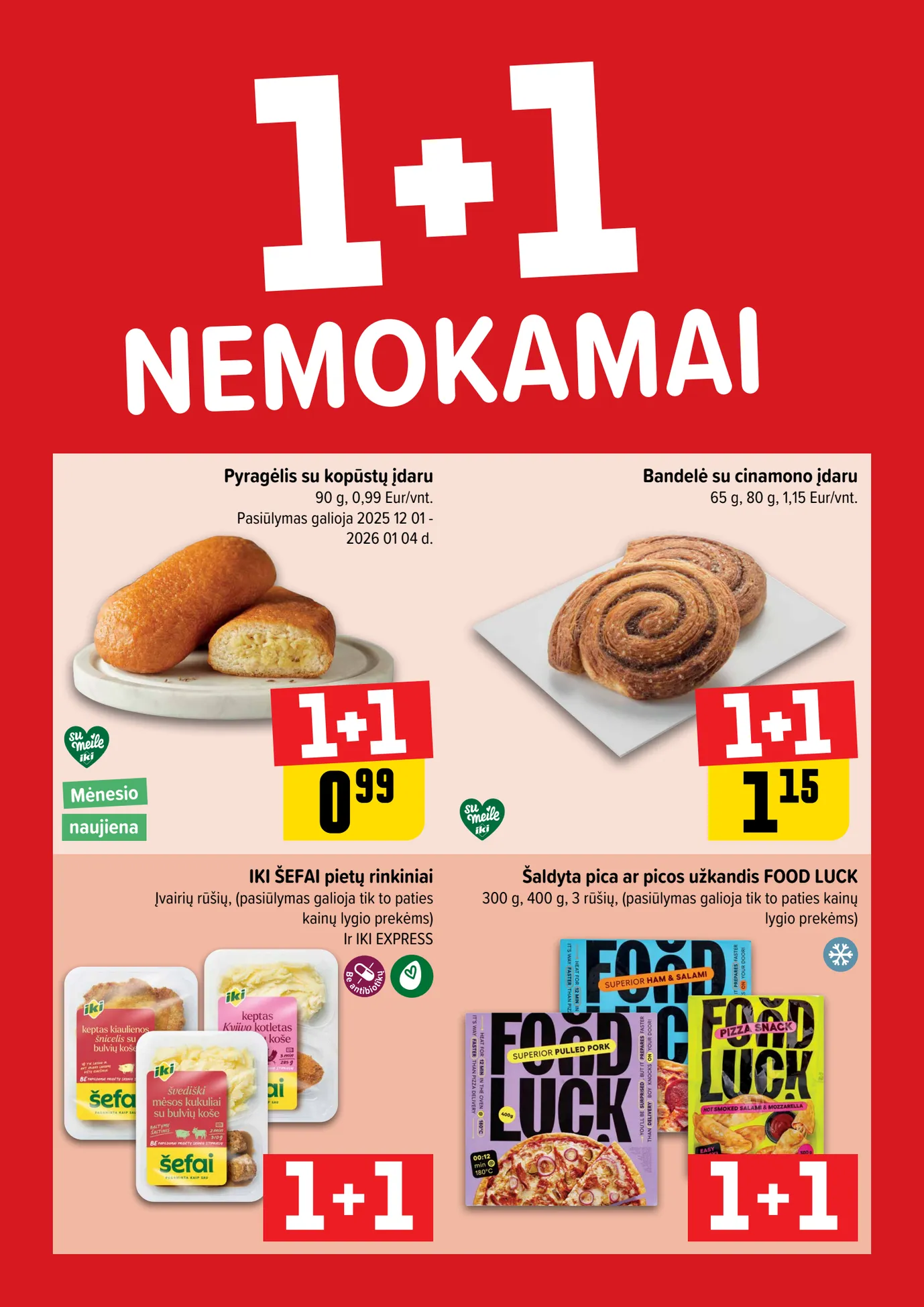 IKI akcijų leidinys "Daugiau yra pigiau Nr. 1" nuo gruodžio 29 d. IKI akcijos: Pyragėlis su kopūstų įdaru už 0.99 Eur, bandelė su cinamonu įdaru už 1.15 Eur, IKI Šefai pietų rinkiniai 1+1, Food Luck pica 1+1!