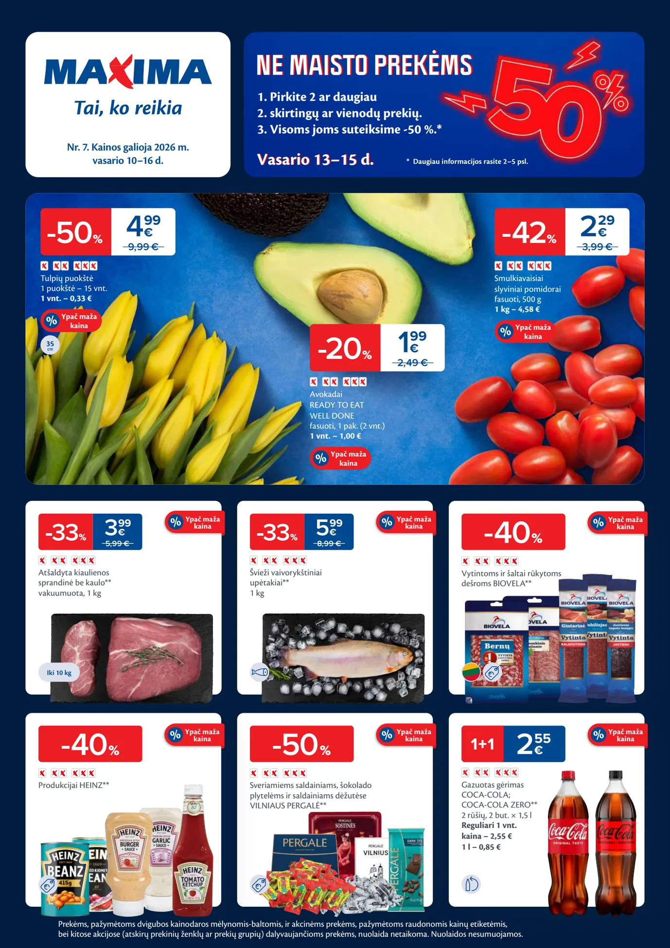 MAXIMA akcijų leidinys Nr. 7 nuo vasario 10 d. Maxima akcijos: -50% tulpės, -42% slyviniai pomidorai, -33% kiaulienos sprandinė, -40% Heinz produkcija, Biovela dešros, Coca-cola 2.55€.