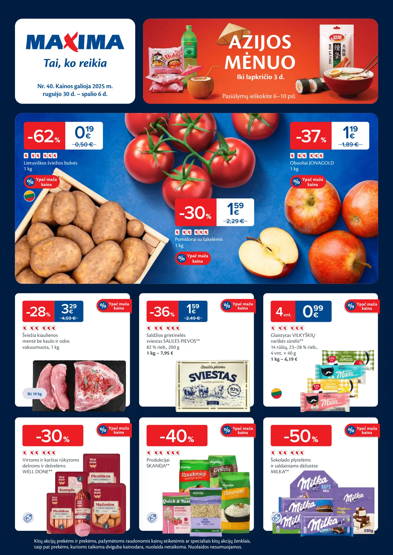 MAXIMA akcijų leidinys Nr. 40 nuo rugsėjo 30 d. MAXIMA: -62% bulvės, -37% obuoliai JONAGOLD, -30% pomidorai su šakelėmis, -50% šokolado plytelės MILKA, -40% produkcija SKANĖJA ir daugiau!