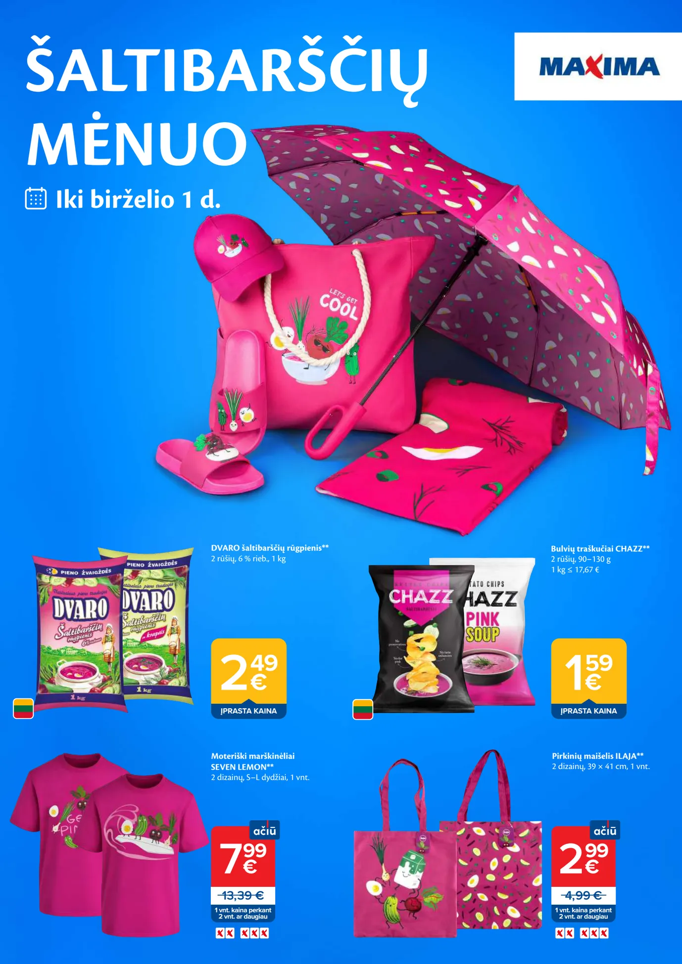MAXIMA akcijų leidinys "ŠALTIBARŠČIŲ MĖNUO" nuo balandžio 21 d. MAXIMA šaltibarščių mėnuo! DVARO šaltibarščių rūgpienis už 2.49€, CHAZZ traškučiai už 1.59€, SEVEN LEMON marškinėliai už 7.99€, ILAJA maišelis už 2.99€!
