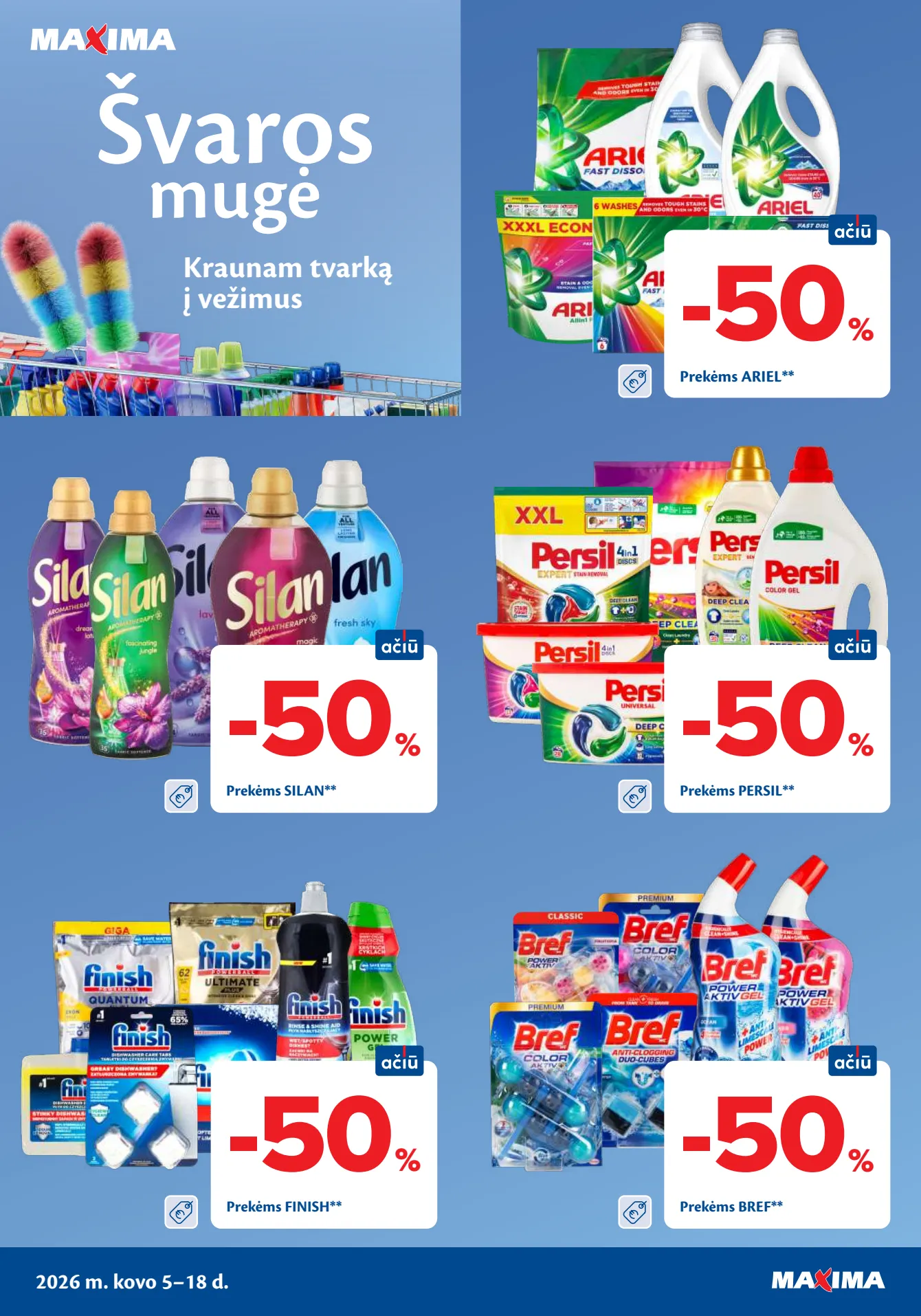 MAXIMA akcijų leidinys "Švaros mugė" nuo kovo 5 d. Maxima švaros mugė: Ariel prekėms -50%, Silan prekėms -50%, Persil prekėms -50%, Finish prekėms -50%, Bref prekėms -50% ir daugiau!