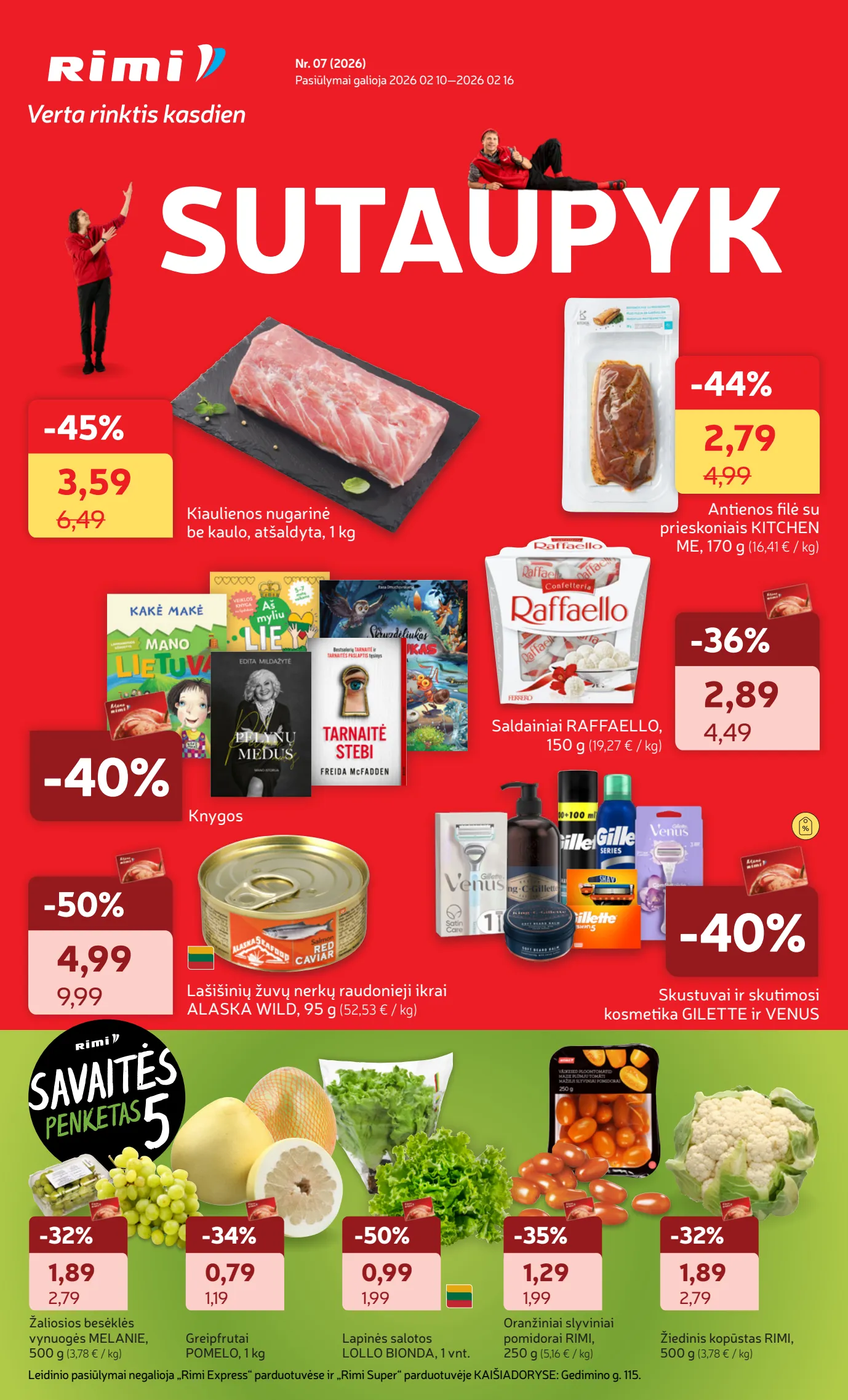 RIMI akcijų leidinys Nr. 7 nuo vasario 10 d. Sutaupyk su Rimi: kiaulienos nugarinė -45%, saldainiai Raffaello -36%, Lašišinių ikrai -50%, Greipfrutai -34%, Gilette ir Venus kosmetika -40%.
